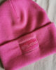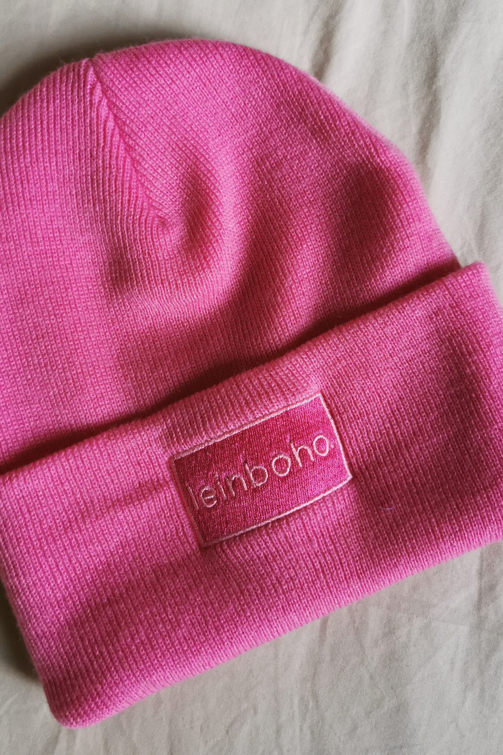 Leinboho propose en édition limitée des bonnets rose flashy avec broderie rectangle rose devant Leinboho.