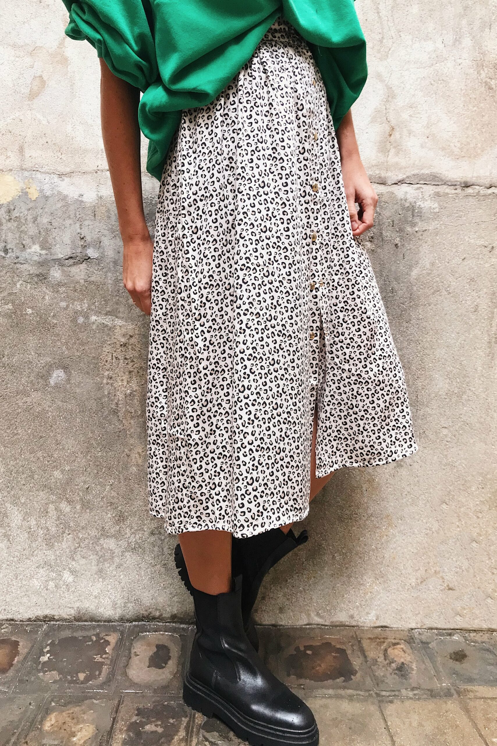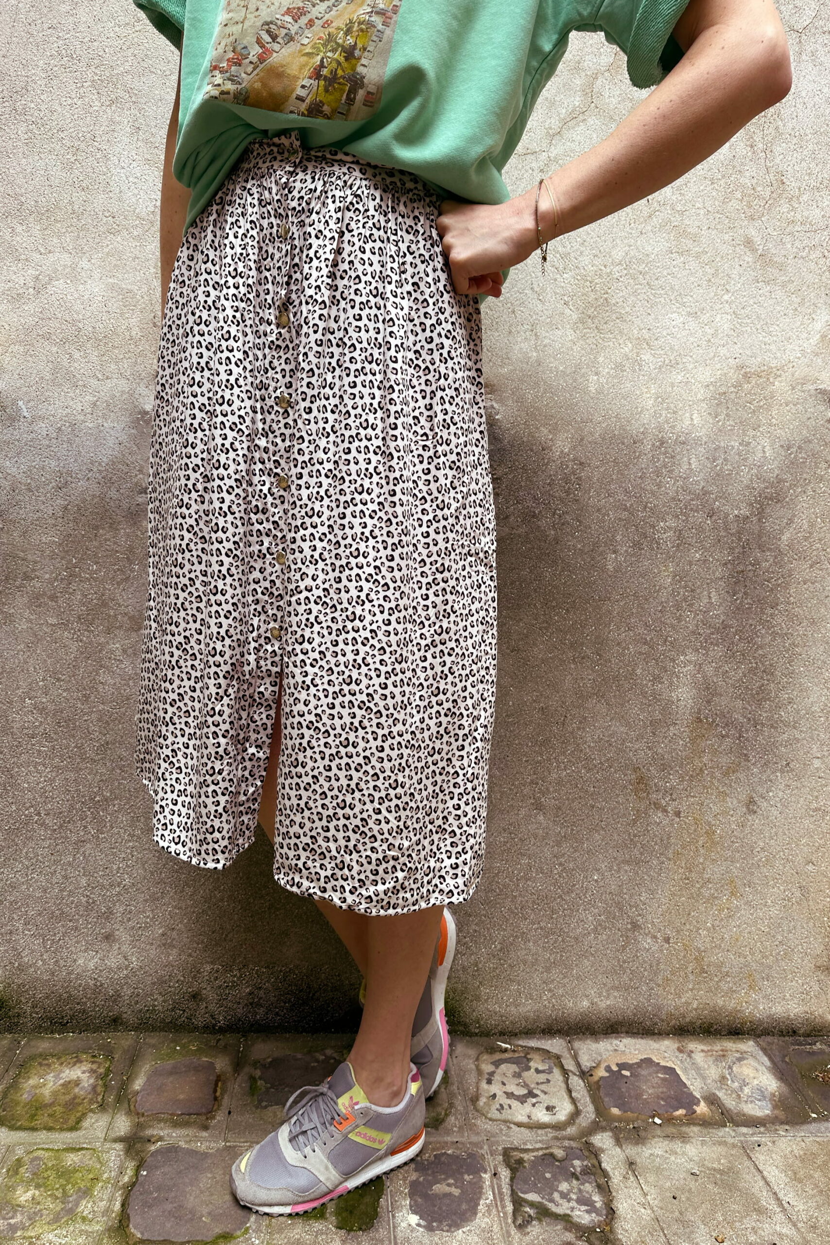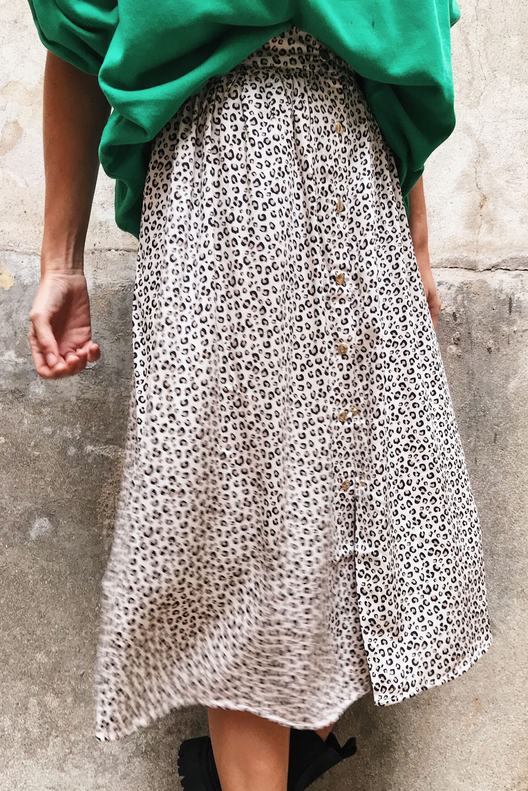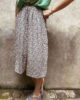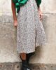 – Jupe en viscose motif motif panthère ivoire tâches noires fermeture avec boutons pressions sur le devant