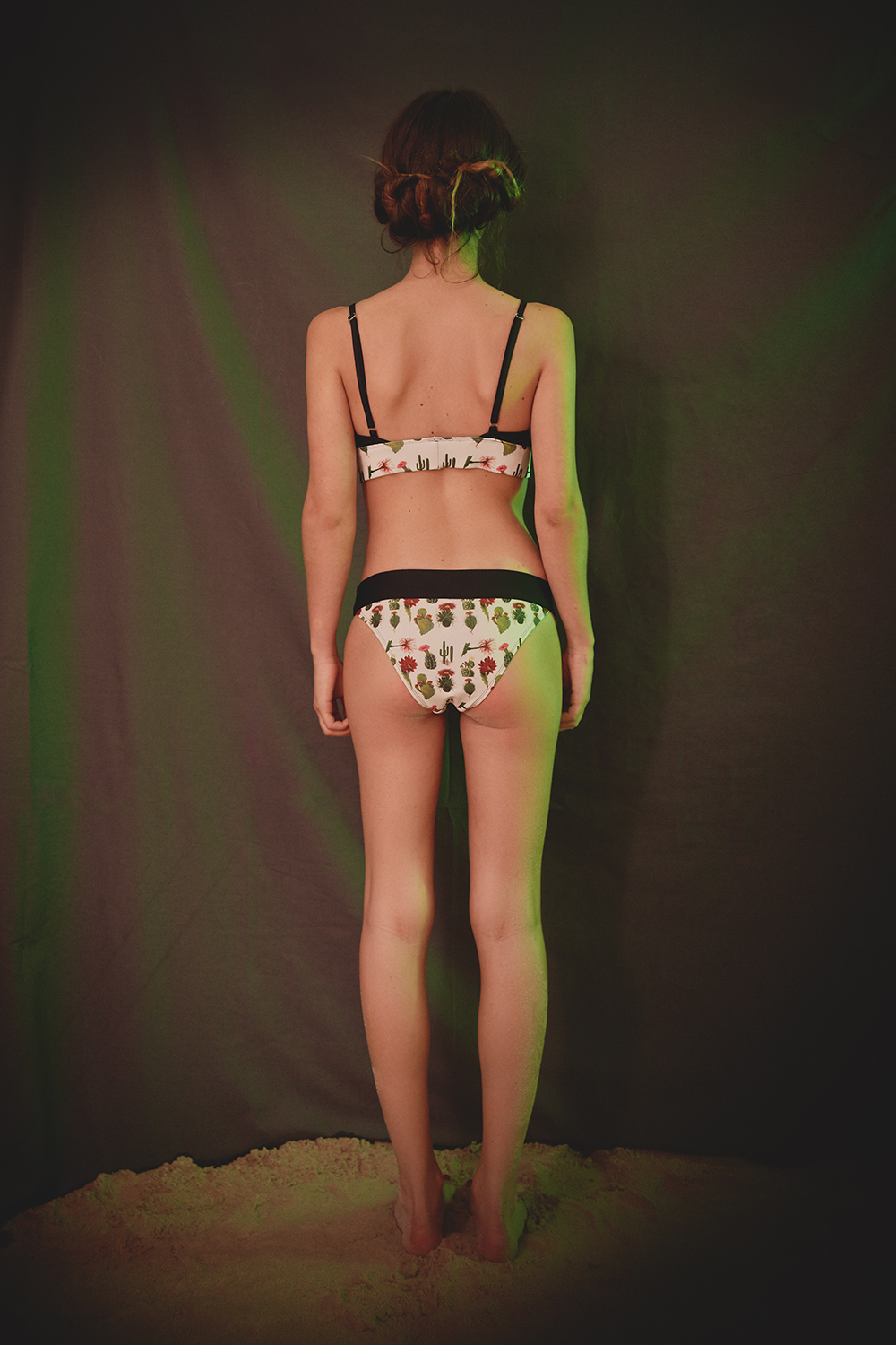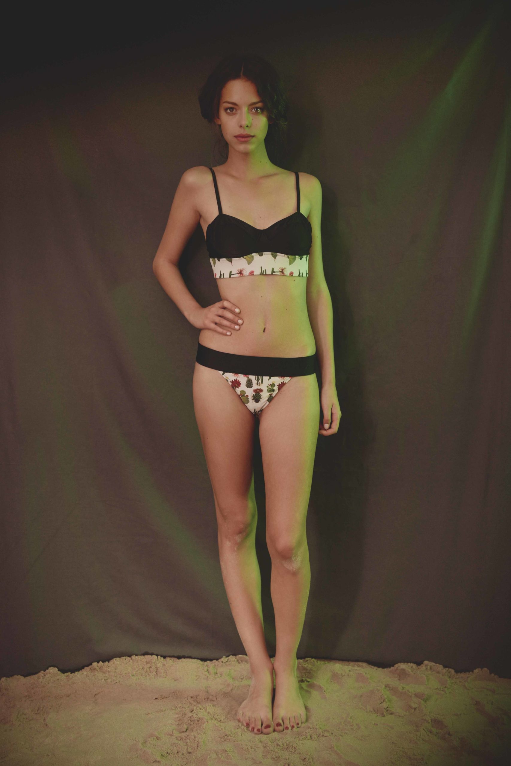 Ce maillot deux pièces , inspirée de la collection Eté 2015 « Viva la revolucion » de Leinboho , est composée de deux tissus : un à motifs Cactus et un tissu uni noir qui vient. Ce maillot peut se porter sous un tee shirt transparent tel une brassière. Le haut du maillot est baleiné et comporte des bretelles réglables. La bande élastiquable à motif cactus permet un meilleur soutien. La culotte est composée également une bande large à motif cactus.