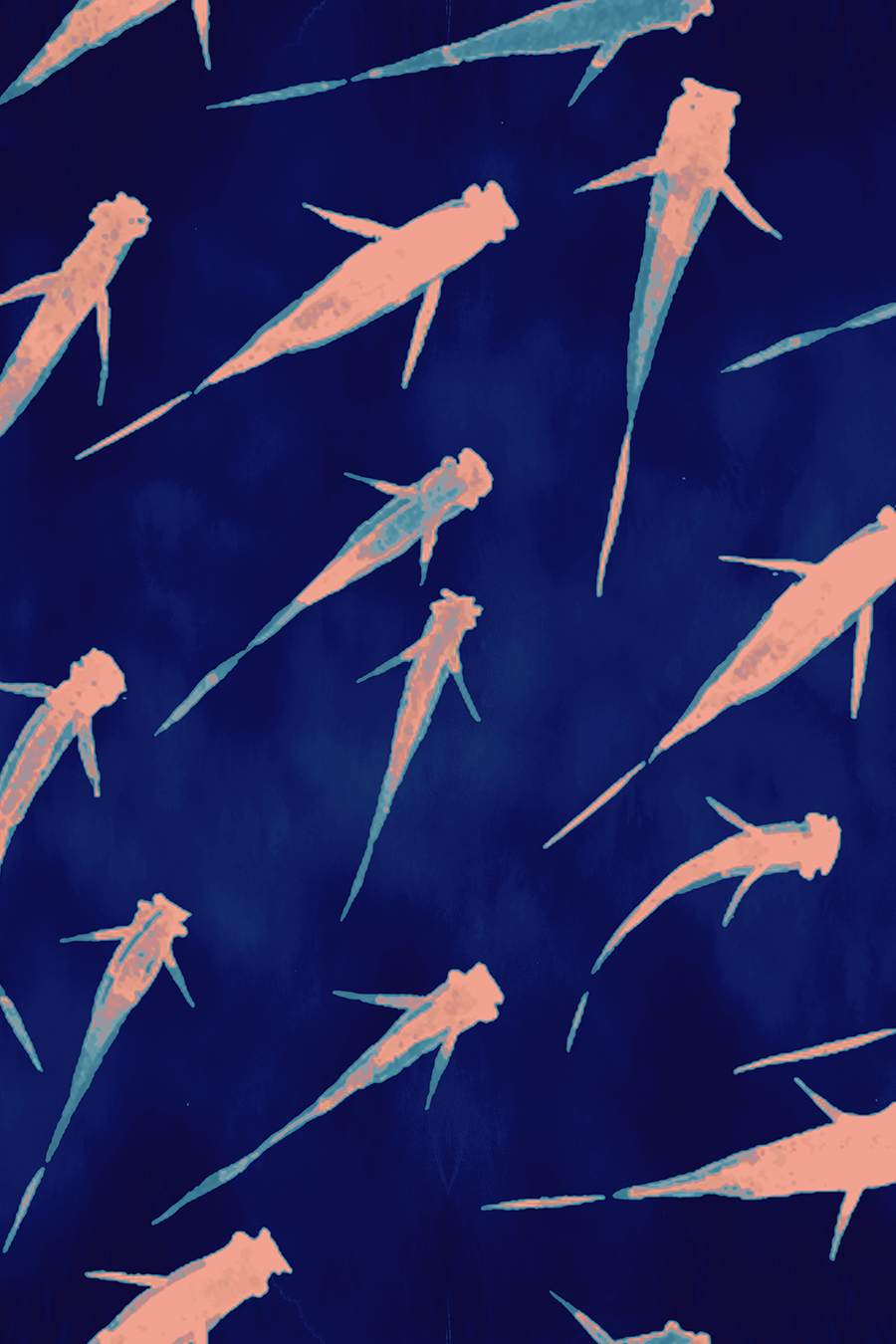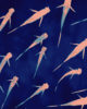 This triangle fish swimwear is printed with white pale pink fishes pattern, on a deep-blue background, designed by leinboho, associated with pink salmon.