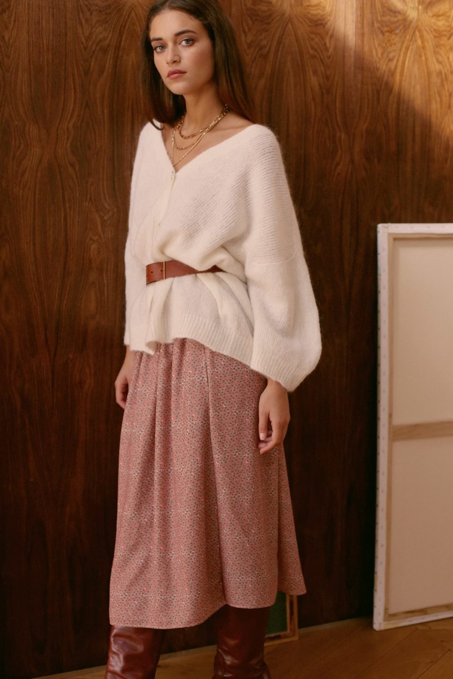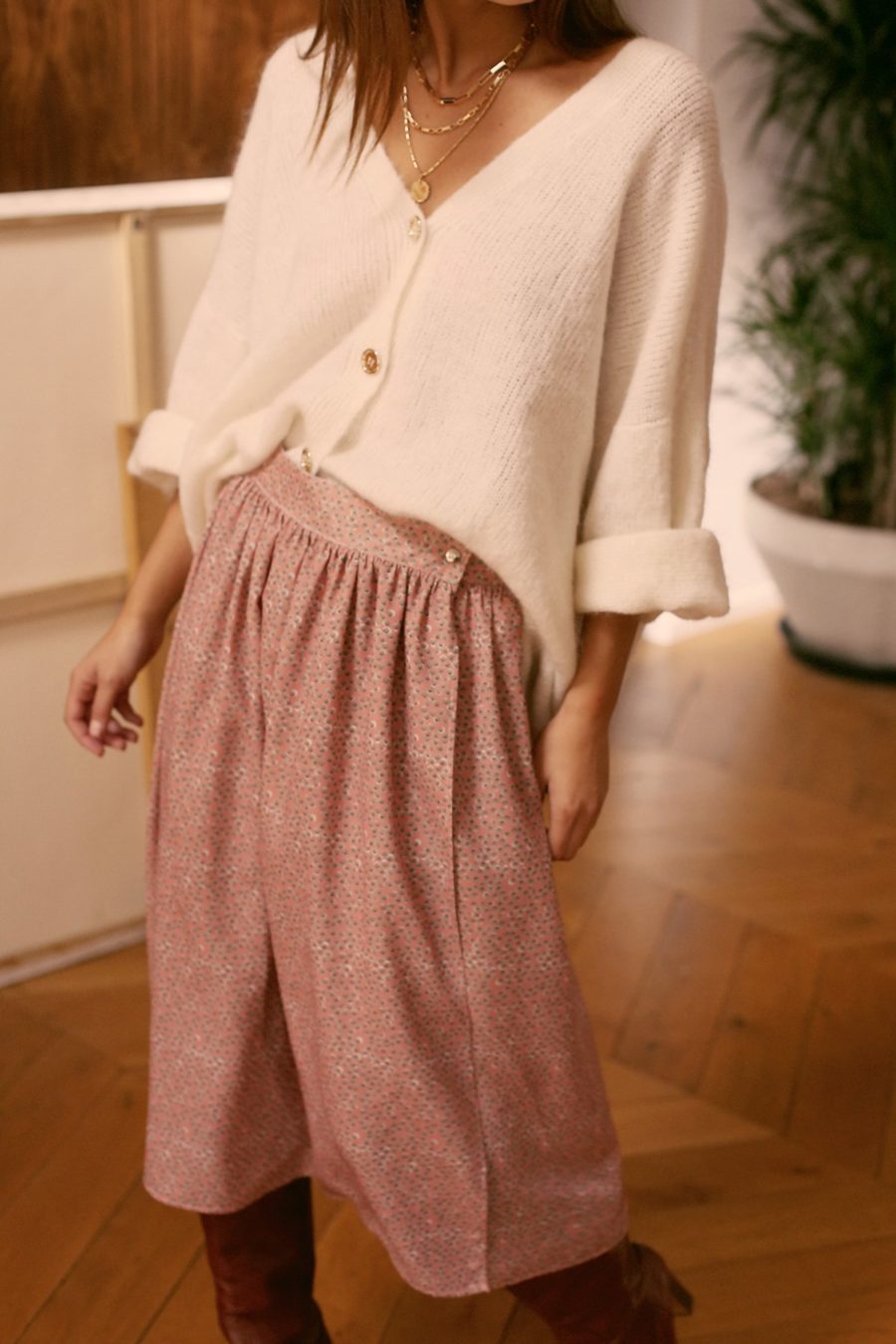 Le haut est souligné par des bandes couleur saumon et se noue grâce à un lien au dos.