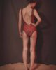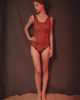Ce maillot de bain une pièce , inspirée de la collection Eté 2015 « Viva la revolucion » de Leinboho , est composée de deux tissus : un à motifs fleurs avec des tons rouges vifs et un tissu uni noir qui vient souligné les contours du maillot. Ce maillot peut se porter tel un body avec un short et chemise par dessus. Il est échancré dans le dos et sur les fesses.