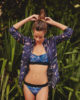 Le maillot de bain deux pièces Watercolor est un triangle imprimé de mélanges de couleurs bleu, mauve et encre pensé par Leinboho et associé à un uni noir. Le haut est souligné par des bandes noires sous la poitrine pour un meilleur maintien. Il y a des armatures à la poitrine. Les bretelles sont ajustables. La culotte est maintenue par des bandes élastiquées.