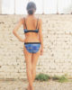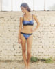 This Watercolor triangle Swimwear is printed with a mix of colors (blue, mauve and ink designed by leinboho, associated with black). The top is underlined with black stripes under the bust, for a better support. A framework on the top. Straps are adjustable and the bottom is kept with elastics bandes.