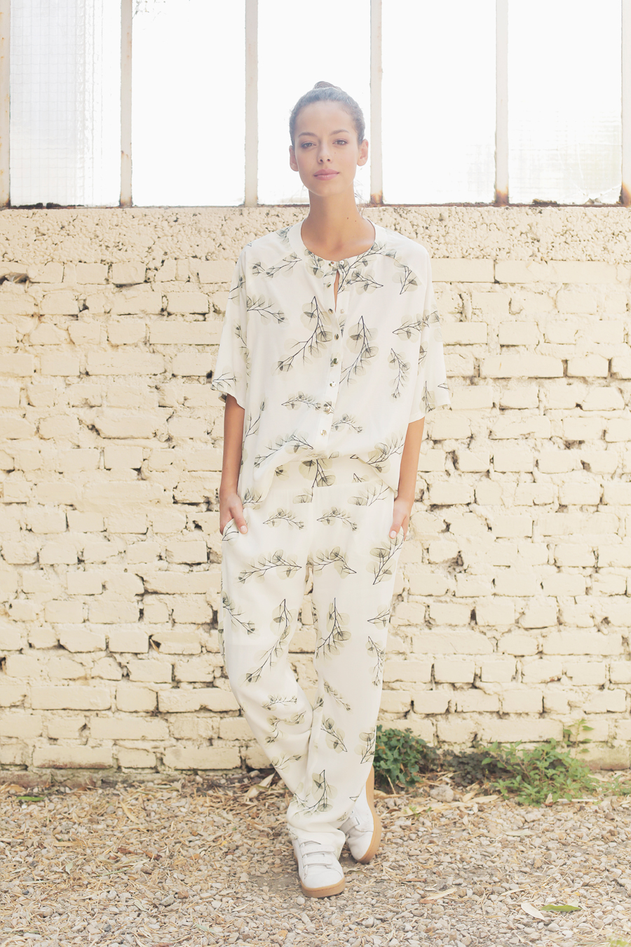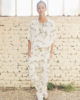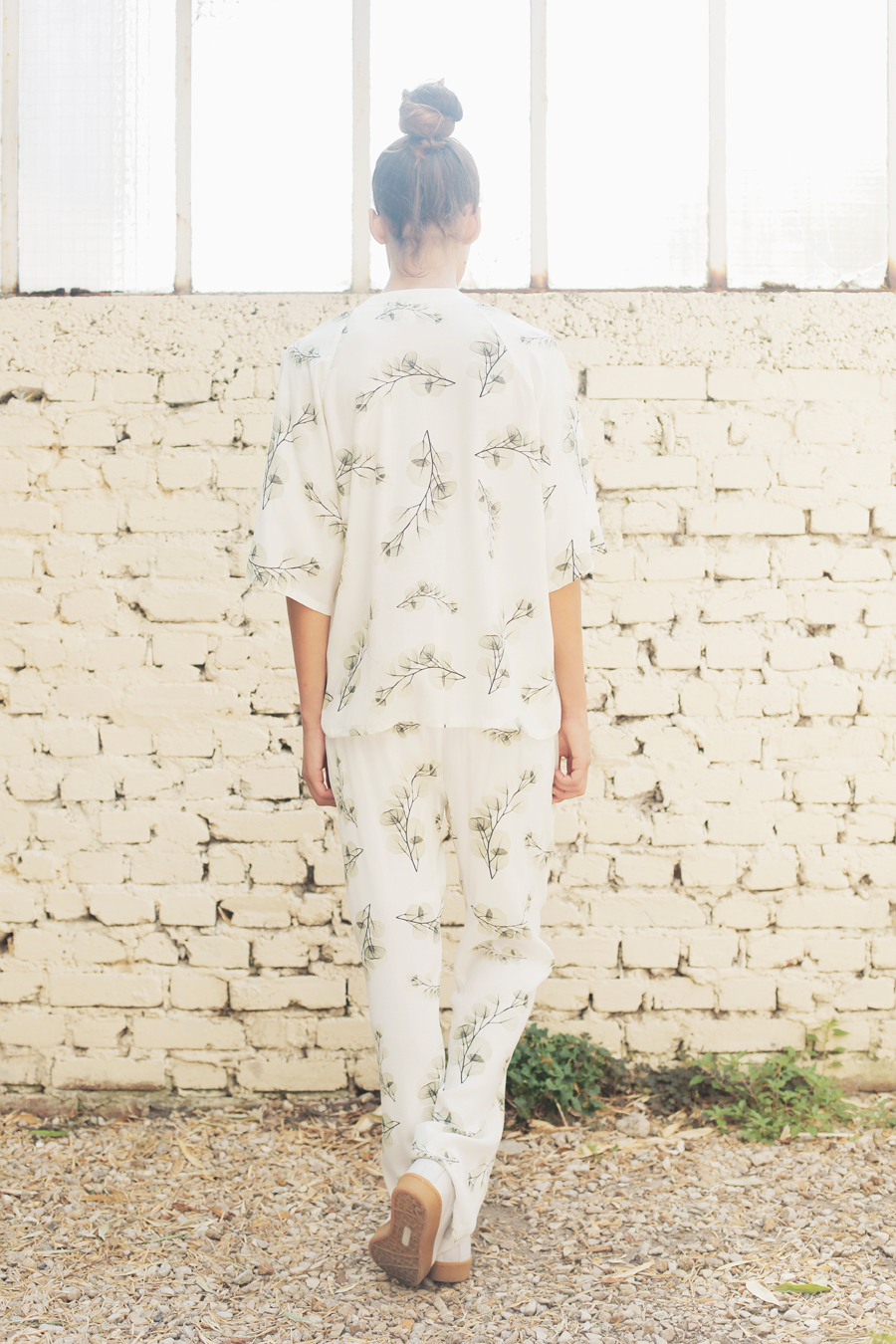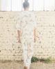 These large blossom pants are made of viscose and printed with white and anis green branches pattern, designed by Leinboho. Pockets are on both sides, waistline is elasticated on the back.