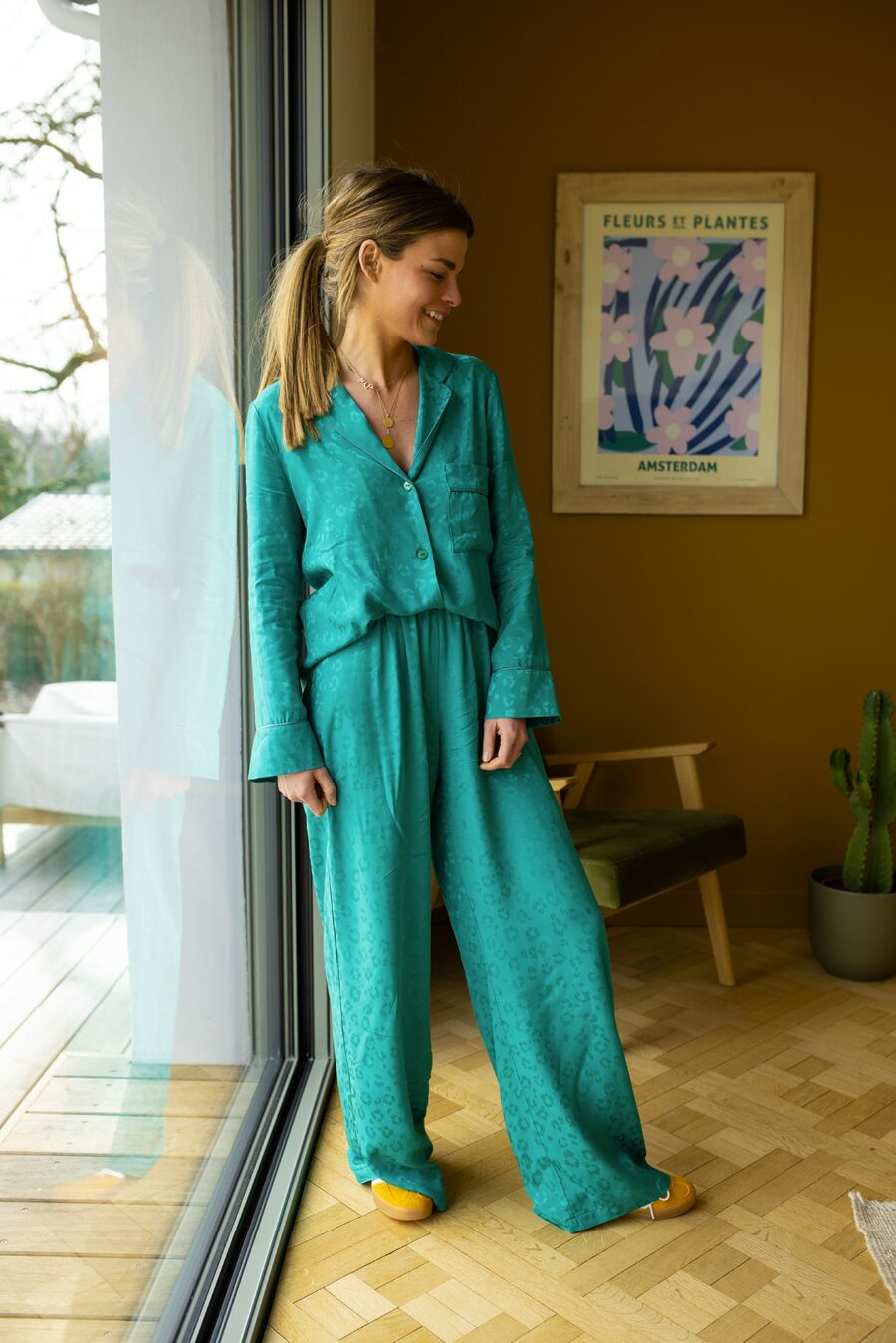 – Pantalon large en imprimé viscose satiné faux uni motif léopard vert sapin