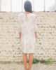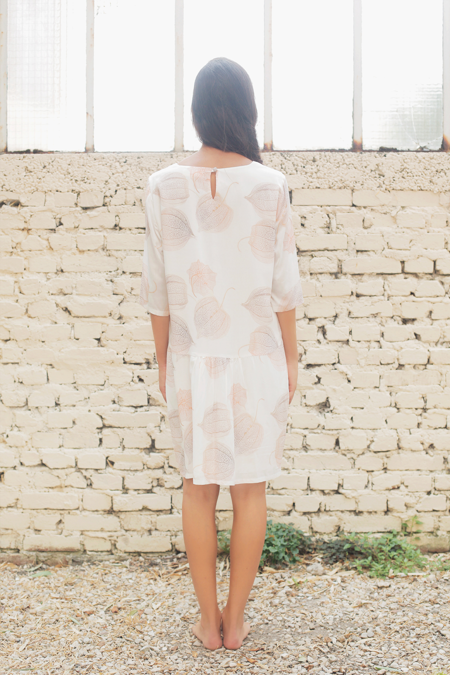 The short Pink Flower dress is completly printed with pink ground cherry flowers. This wide dress, with three-quarter sleeves, has frowns on the waistline and pockets on both sides. A closure and a covered button on the back top.