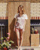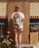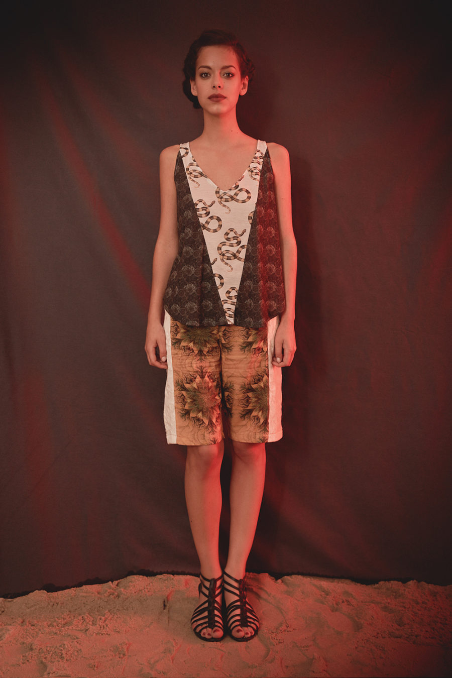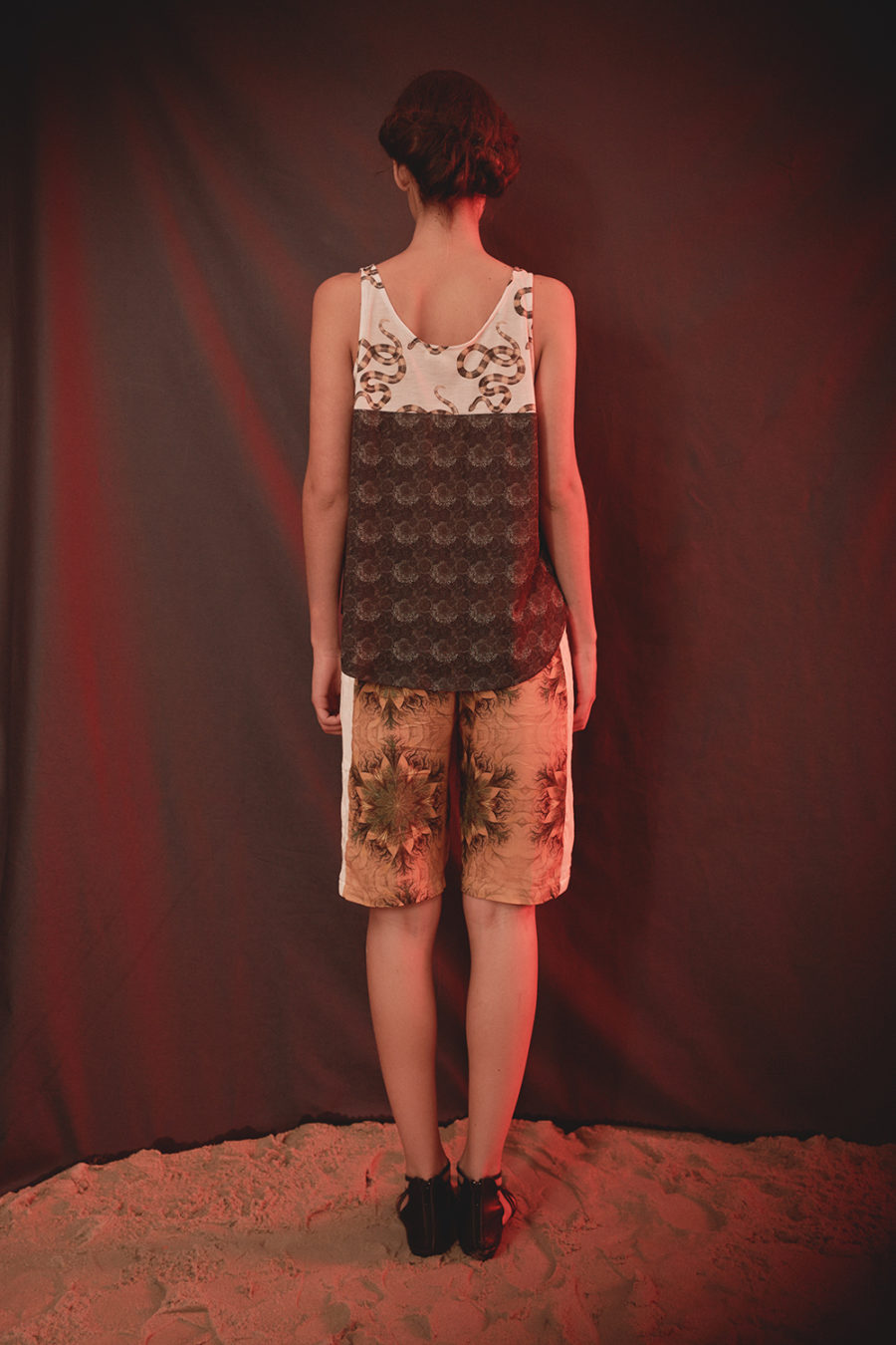 Ce tee shirt col V Venice, inspirée de la collection Eté 2014 « Paradise » de Leinboho , combine deux matières: une dentelle fine écrue et un jersey souple imprimé représentant un paysage de palmier. Ce motif, conçus en France, a été créé par et pour Leinboho. Ce top peut se porter aussi bien en journée de façon décontractée qu’en soirée.